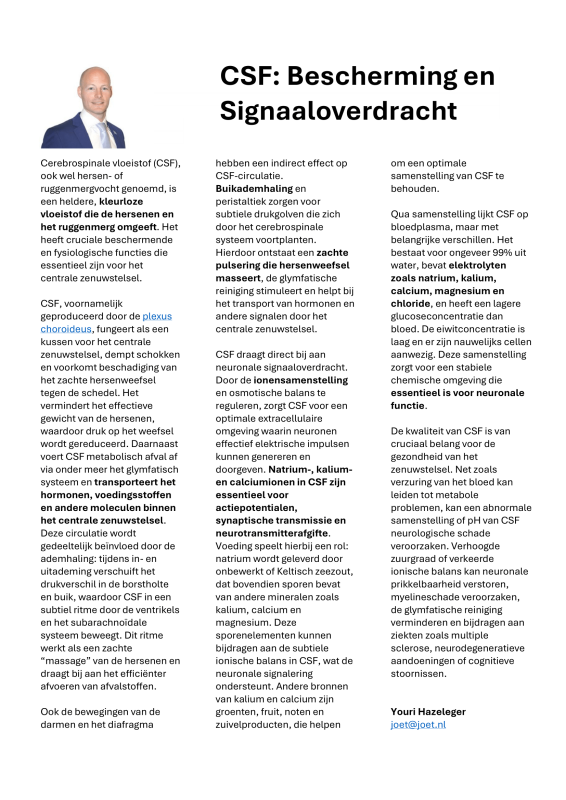 CSF, voornamelijk geproduceerd door de plexus choroideus, fungeert als een kussen voor het centrale zenuwstelsel: het dempt schokken, voorkomt beschadiging van het zachte hersenweefsel en vermindert het effectieve gewicht van de hersenen (NCBI Bookshelf, 2025). Daarnaast voert CSF metabolisch afval af via het glymfatisch systeem en transporteert het hormonen, voedingsstoffen en andere moleculen binnen het centrale zenuwstelsel (MacAulay et al., 2022).